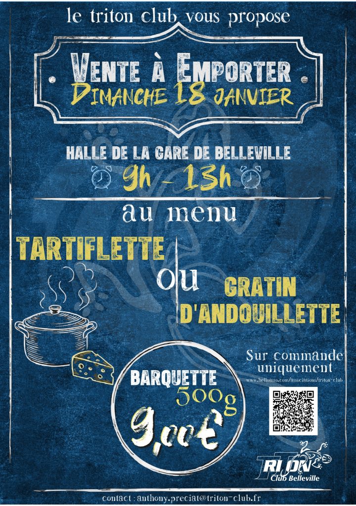 Le Triton Club organise sa première vente de plats chauds le 18 janvier 2026, à la Halle de la Gare de Belleville, de 9h à 13h ! Au menu, à emporter uniquement : Tartiflette Gratin d’andouillette Barquette de 500 g à 9,00 € Vente sur réservation uniquement — cela nous permet d’éviter le gaspillage Pour réserver, c'est par ici :https://www.helloasso.com/.../vente-de-plats-chauds-2026 Une buvette vous accueillera chaleureusement le jour du retrait N’hésitez pas à partager l’info autour de vous… t...